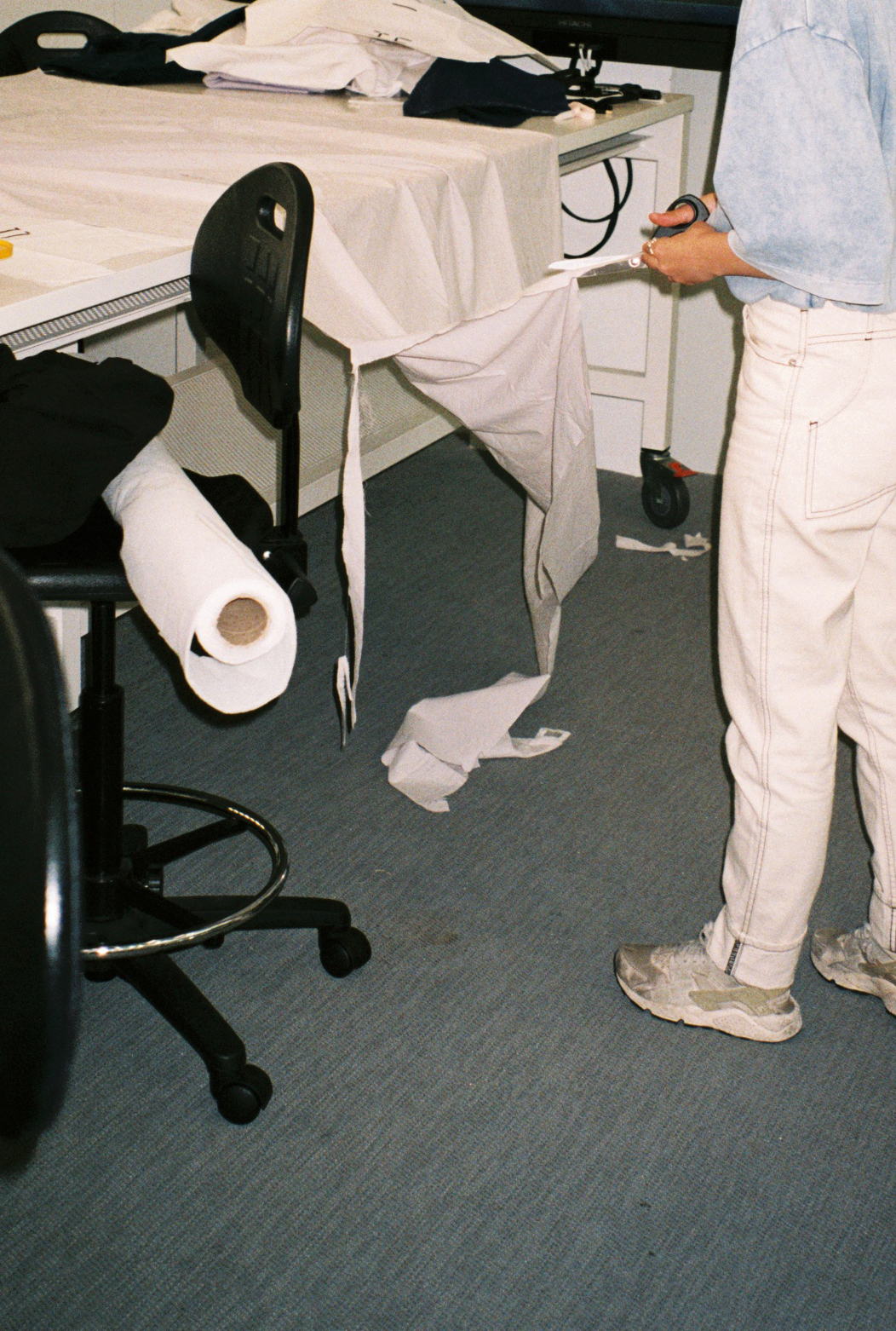 2 Shape I = trouser leg repurposed cotton with seam tape and ribbons.